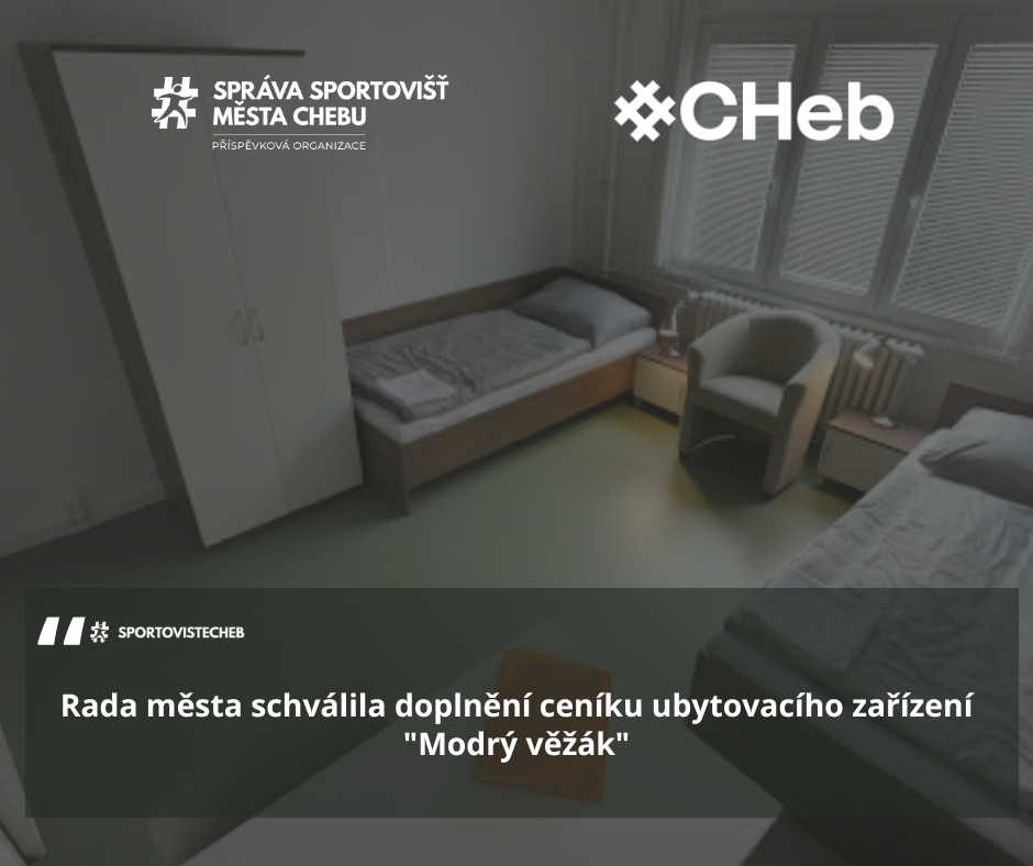 Rada města Chebu na svém jednání dne 4. dubna 2024 schválila usnesením RM č. 236/5/2024 doplnění ceníku ubytovacího zařízení "Modrý věžák", který provozuje od roku 2022 Správa sportovišť města Chebu, příspěvková organizace. Ceník městské ubytovny byl doplněn o sazbu pro příslušníky IZS, kteří vypomáhají v našem regionu. Aktualizovaný ceník včetně dalších informací o ubytovně naleznete na stránce www.modryvezak.cz.