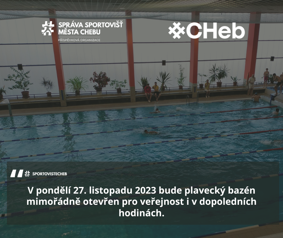 Z důvodu plánované stávky na školách bude v pondělí 27. listpadu 2023 městský plavecký bazén v Chebu, který je obvykle v těchto hodinách vyhrazen pro školní výuku, mimořádně otevřen pro veřejnost. Otevírací doba pro veřejnost bude v tento den od 8:00 do 13:30 a od 16:45 do 20:00.